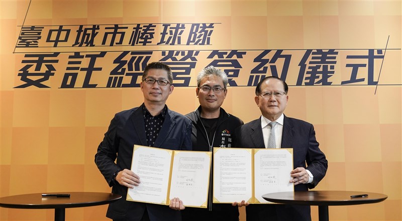 台中成棒隊將由中信育樂承接,台中市運動局長李昱叡(中)、中信育樂董事長陳國恩(右)、學思動力行銷公司董事長林智豪(左)共同出席簽約儀式。圖/中信育樂提供