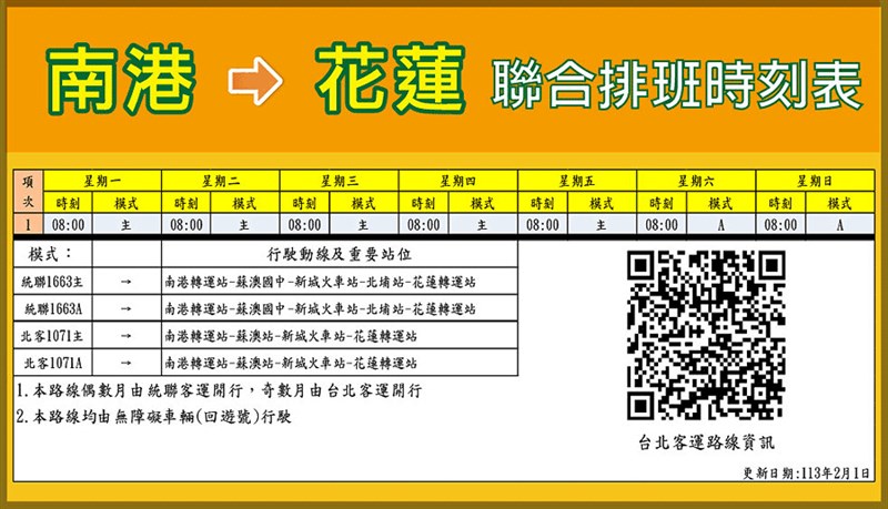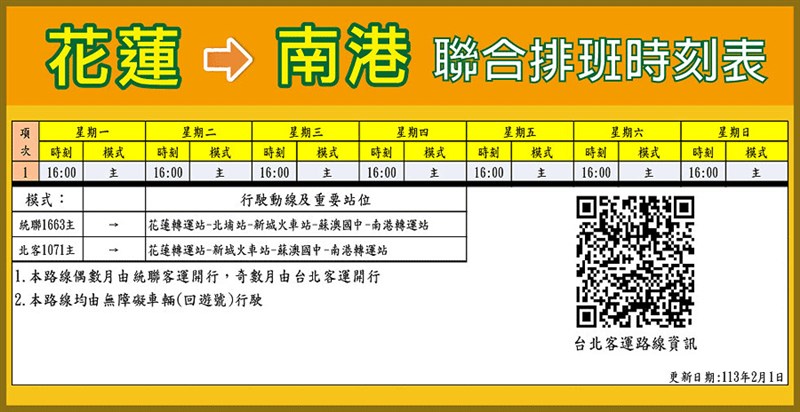 客運聯合排班第二槍 即日起南港=花蓮線2客運砍班行駛 吳亭頤 |2024.02.01 語音朗讀 520觀看次 字級 大 中 小 統聯客運、台北客運即日起實施「南港-花蓮」國道客運路線聯合排班。圖/資料照片 【記者吳亭頤綜合報導】客運業存在人力不足的問題,加上乘客持續流失,統聯客運、台北客運宣布,即日起「南港-花蓮」國道客運路線實施聯合排班, 統聯客運行駛偶數月,奇數月由台北客運營運,班次從每日往返各2班,縮減為往返各1班。根據統聯客運官網最新資訊,即日起實施「南港-花蓮」國道客運路線聯合排班, 統聯客運所屬「【1663】南港-花蓮」行駛2月、4月、6月、8月、10月、12月等偶數月; 台北客運所屬「【1071】南港-花蓮」行駛3月、5月、7月、9月、11月等奇數月;若車票未使用(含套票), 敬請民眾持原車票至統聯各自營站售票窗口辦理退票(免扣手續費)。統聯客運在去年9月就與國光客運實施「台北-屏東」、「台北-彰化」、「台北-員林」等6條國道客運路線聯合排班。交通部公路局表示,統聯、北客「南港-花蓮」為第2起申請聯合排班路線,希望在民行不中斷下讓業者更有效率經營,有多少需求就提供多少供給;聯合排班只是營運策略之一,其他像是調整路線也是選項之一,目前尚未有其他路線跟進申請聯合排班。統聯客運、台北客運「南港-花蓮」路線實施聯合排班,偶數月由統聯客運營運,奇數月由台北客運。圖/取自統聯客運官網統聯客運、台北客運「南港-花蓮」路線實施聯合排班,偶數月由統聯客運營運,奇數月由台北客運。圖/取自統聯客運官網 前一篇文章 筆力萬鈞!華梵大學齊聚20位名家 舉辦迎春書法展 下一篇文章 羽球/年前一睹小戴風采 周六高雄鬥拍祭優惠 熱門新聞 01補充纖維、鈣、鎂、鉀 預防多種疾病風險2025.11.1102印尼佛教大學、佛光山叢林學院 簽MOU2025.11.1203【遊藝筆記】 天涯海角一坡翁2025.11.1104多倫多佛光山 獲頒建築文化遺產獎2025.11.1205攝影師造池塘 重建沙漠生機2025.11.1106【臆想截圖】 蔥蘭今生與來世2025.11.1107比利時國小師生 靜坐、抄心經2025.11.1108【論愛談情】愛,無須卑微2025.11.1109修行入廚慈悲入味 台韓寺剎飲食交流2025.11.1210佛光會參與COP30 推廣環保與心保2025.11.13 訂閱電子報 台北市 天氣預報 台灣一週天氣預報 相關報導 兩岸、日韓關係牽扯 韓黑鷹特技小組 缺席杜拜航展台中甲埔大道 明年首季通車川普第2任期 首軍售台102億M1A2T將納入國軍指管系統修舊如舊 瑞三礦業整煤廠再生通霄電廠閃鳳凰 大煙囪「放倒」 作者其他文章中斷15年 阿里山林鐵7/6全線通車台鐵加祿站 旅客成長百倍中職統一獅 奪第17座季冠軍莫莫尼:叛逆少年 渴望被聆聽、被理解塞爾蒂克捧第18冠 超越湖人登頂NBA台鐵貨運新車 R200報到