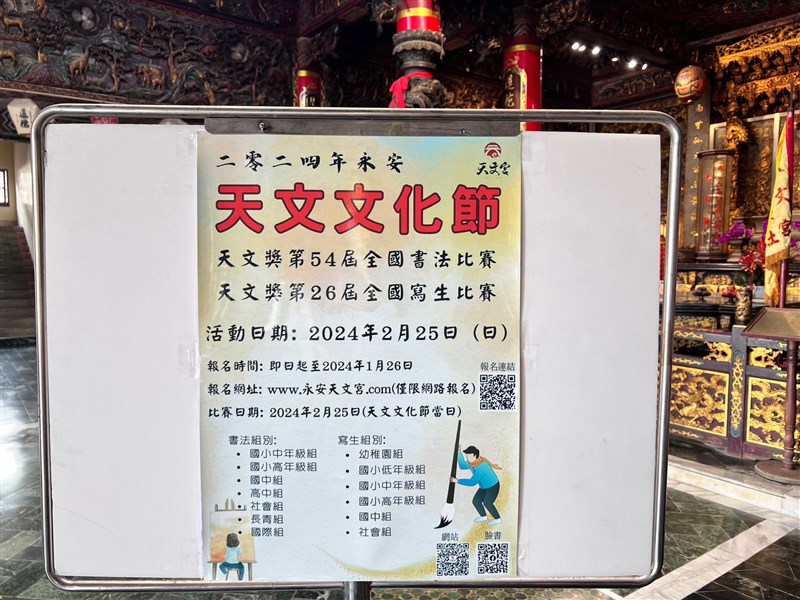 陶冶心性 天文文化節傳承逾半紀書法賽 王淑芬 |2024.02.01 語音朗讀 1742觀看次 字級 大 中 小 「天文文化節」吸引近千人報名參加書法比賽,這項活動傳承逾半世紀。圖/天文宮提供 【記者王淑芬高雄報導】書法是漢字藝術,也是中華文化的傳承。高雄市永安天文宮沿襲每年正月會舉辦書法比賽,今年第54屆的「天文文化節」進入緊鑼密鼓籌辦階段,逾千人報名書法和繪畫,有長青組、國高中及國小組、社會人士等,尤其還有遠自日本等外籍人士參加。永安是一個小漁村,天文宮是地方的信仰中心,主祀唐代名將徐府千歲,除了宗教廟會活動,每年元月元宵節後會舉辦書法比賽,自民國69年起,辦理文化藝術活動,廟方不僅分齡競賽,也提出高額獎金,長青及學子都熱情參與,每年都吸引逾千人比賽,熱鬧不已。天文宮主任委員鄭正昌今(2/1)日指出,寫書法能讓人心平靜,練字更是修心養性的心性陶冶,廟方一直以來都會鼓勵民眾參與書法及繪畫寫生,用藝文豐富人生。今年文化節的比賽日期訂於農曆元月16日(國曆2月25日)。圖/天文宮提供今年是天文宮第54屆書法比賽,特別邀請書法家張炳煌擔任評審,多位專家一起鑑別參賽者書法的功力。今年持續發給書法比賽社會、長青組第一名1萬元,其它名次也酌增獎金。書法比賽以國小3年級以上為參加對象,共分6個組別。另外寫生比賽也吸引600人參賽適逢農曆元月,廟方特別準備熱粥、平安麵和到天文宮走春的人結緣,預估當天參賽、信眾和到廟裡祈福者眾,將準備數千人份的平安餐,和大眾共享。圖/天文宮提供鄭正昌說,當天恭祝王爺聖誕,藝文活動之外,還有博杯送王爺加持過的智慧筆。廟方準備3支智慧筆,開放給大眾信徒擲杯比賽。因為只有3支筆,所以每年都吸引很多學子參與博杯,珍稀且靈驗,讓很多贏得神明加持智慧筆的人都能考取好功名,不少人取得碩、博士學位後回到廟裡還願。 前一篇文章 「出日頭」草地音樂會 露天聆賞台灣歌謠 下一篇文章 千龍迎新年 高美館攜手學生探索在地色彩之美 熱門新聞 01【閃文集】 駝峰天使2025.11.0402台中新社花海 重現經典卡通2025.11.0603WTA、ATP年終賽 獎金創新高2025.11.0704佛光佈教師、友愛服務隊 精進行佛2025.11.0605《365日》贈嘉義香湖國際大飯店 佛光人結書香善緣2025.11.0606星雲大師全集【傳記】百年佛緣─生活篇 我的衣食住行 5 - 22025.11.0407星雲大師全集【傳記】百年佛緣─生活篇 我的衣食住行 5 - 32025.11.0508腸道是人體第二大腦 影響情緒睡眠免疫力2025.11.0409山本由伸 拚美職首座賽揚獎2025.11.0510古老金幣2025.11.05 訂閱電子報 台北市 天氣預報 台灣一週天氣預報 相關報導 《風土心》典藏展 再現土地情感與生命追求高雄春藝重磅登場 三檔國樂新舊相融再現眷村場景 《六公里的返鄉路》獲休士頓影展金獎跟著時空旅人 探索現代建築與歷史場域故事再現傳統戲曲榮光 地藏庵化身戲台上演八仙傳奇讓心靈反璞歸真 鄭宗龍《毛月亮》國際巡演獲好評 作者其他文章學童當小農 種出玉米窗簾大崗山淨山健走行三好 佛光人守護山林佛光山書蔬展11月8日登場 好看好吃好玩一針一線60載 林全誠繡出神韻人生紫斑蝶越冬 現幽谷奇景墨光.流變 開創複合型水墨新風貌