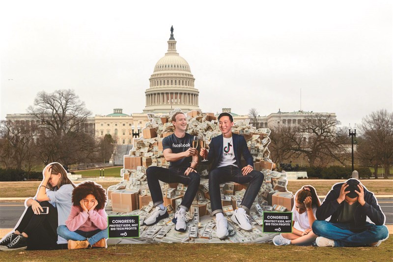 企業問責團體1月31日在華盛頓設置臉書母公司Meta執行長祖克柏(左3)和抖音海外版TikTok執行長周受資的人形立牌,要求高科技公司採取更多措施保護兒童。圖/美聯社