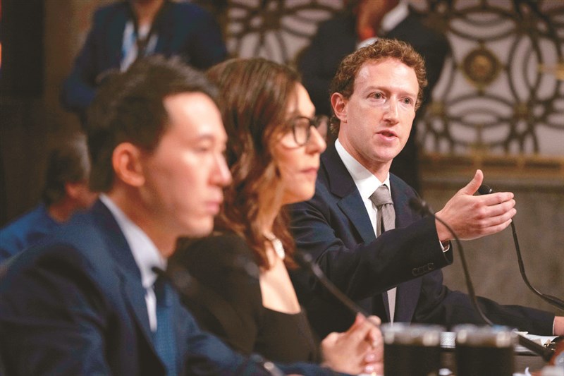 美國參議院司法委員會1月31日在華府國會山莊召開聽證會,就兒童暴露在社群媒體的危險,質問平台高層主管,臉書母公司Meta執行長祖克柏(右起)、X執行長雅克里諾和抖音海外版TikTok執行長周受資到場作證。圖/美聯社