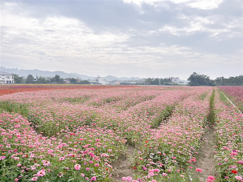 美濃花海在2月1日至29日以以「美濃冬遊記」為主題,打造4大區域花海,種植大片面積的向日葵、百日草及波斯菊供遊客打卡拍美照。圖/客委會提供