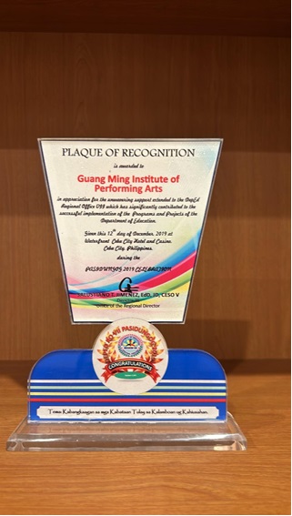 Dr. Salustiano T. Jimenez, Regional Director Department of Education – VII from Department of Education Cebu City is presenting recognition pledge to FGS Siddhartha Theater Ensemble for steadfast commitment to deliver quality basic education in Central Visayas. This pledge was received by Director Junrey Alayacyac. This is the second time FGS to be recognized with an educational contribution; the first award was in 2019.