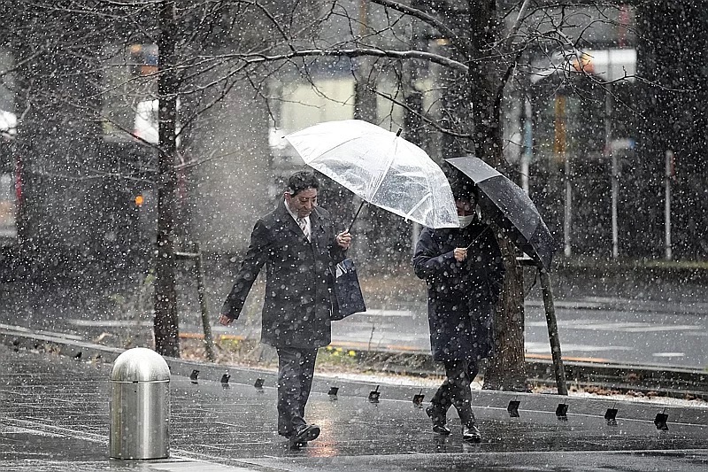 日本氣象廳今天下午4時30分左右,針對東京都內包含八王子市為主的多摩局部地區發布大雪警報。這是東京都2023年年底入冬以來,首度有地區接獲大雪警報。圖為人們在東京街上行走。圖/美聯社