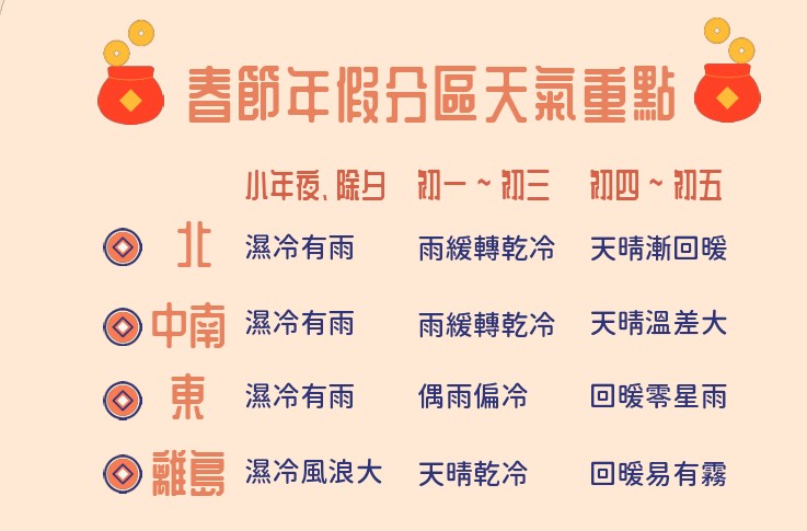 春節天氣分區重點。圖/中央氣象署提供