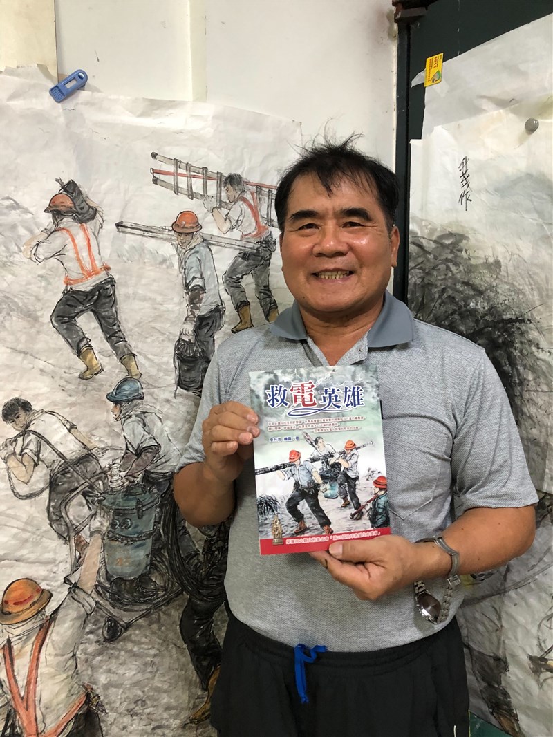 【記者羅智華台南報導】以水墨描繪救電英雄辛勞!今年六十八歲的退休台電員工李升茂,除長年翻山越嶺、前進偏鄉搶修電線,還用工作之餘創作、勾勒一幅幅台電員工冒險攀爬電線桿配電的作品,細膩畫風不僅獲「台灣首位桿上水墨畫家」美譽,並在日前出版新書《救電英雄》,藉水墨與文字讓大眾感受台電人如何風雨無阻、以一把銲槍照亮家家戶戶的心路歷程。