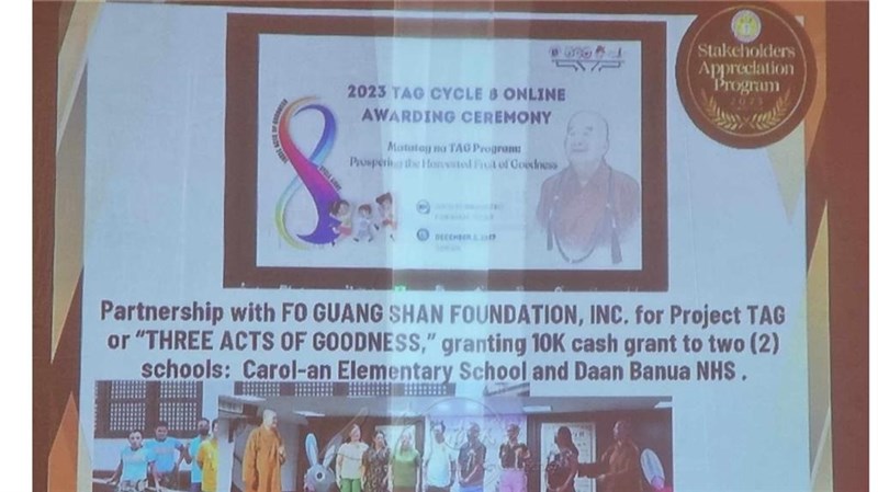 On February 2nd, the Kabankalan City Education Office held a special award ceremony to express sincere gratitude to the Fo Guang Shan Foundation Philippines for its long-term support of the Three Acts of Goodness Campus Project. Cora Romera, the English Secretary of the Buddha’s Light International Association Philippines – Bacolod Chapter, represented Fo Guang Shan and accepted the certificate of appreciation.