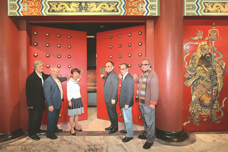 國立台北大學民俗藝術與文化資產研究所兼任教授李乾朗(左起)、史博館門神彩繪維修藝師莊武男、史博館館長王長華、文化部長史哲、國立故宮博物院前副院長暨台灣前輩畫家林玉山家屬林柏亭、國立成功大學歷史系名譽教授蕭瓊瑞,共同開啟史博館紅色正門,宣告開館。圖/蘇健忠