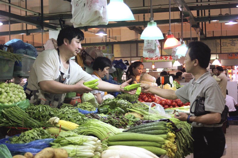 大陸官方最新統計顯示,2024年1月CPI年減0.8%,繼續下滑。圖為上海民眾在菜市場購買蔬菜。圖/美聯社