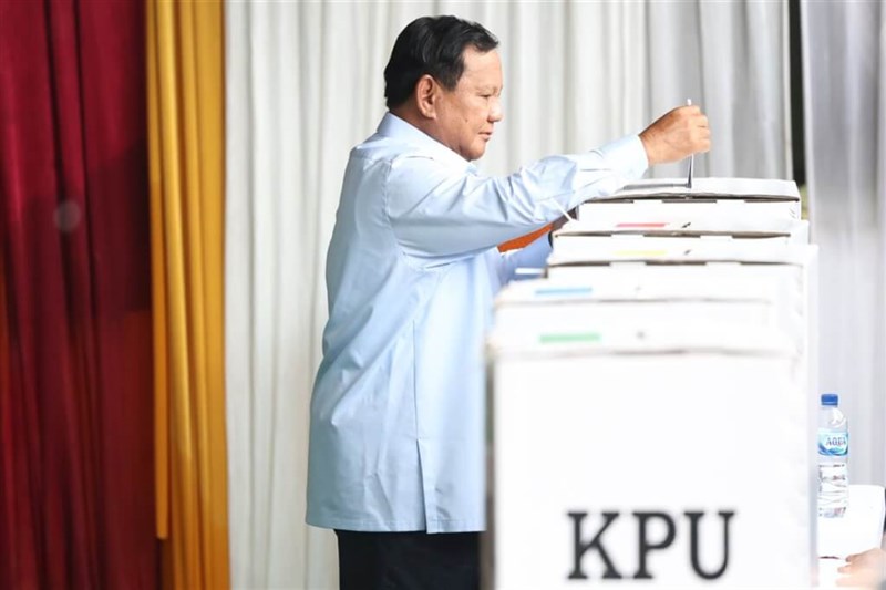 印尼總統大選14日登場,非官方計票顯示候選人普拉伯沃遙遙領先,得票率近6成。圖為普拉伯沃上午投票。圖/普拉伯沃競選團隊提供