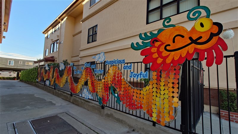 The exhibition of "Clouds and Water Dragon" showcases two dragons bestowing blessings, one on the outdoor corridor and the other welcoming visitors inside the Main Shrine. Lynette King, the designer of the outdoor Cloud and Water Dragon, expressed gratitude for everyone's efforts in transforming recycled materials "from unwanted to wanted—from mundane to extraordinary!" The dragon spans 46 feet, with its vibrant 1/2” plywood head held high leisurely, grinning from ear-to-ear, and coming to greet and to welcome all beings, including local neighbors walking or driving by. The community has been delighted to see the visiting lucky dragon and have been amazed as it comes to life at night with LED lights aglow. During daytime, its shimmering painted array of warm-hued red, orange, and golden yellow recycled plastic lid scales have been cleverly stapled together, dangle, and sway in unison by gentle breezes—which seem to lift the dragon into flight amidst the surrounding puffy clouds and bring to life Venerable Master Hsing Yun’s 2024 New Year’s Blessing to ALL: “May You Be Free As Cloud and Water, Auspicious and JOYFUL!” Its long flowing majestic body—made from one long continuous piece of old thick braided rope, found discarded in the alley behind the temple, coiled around a large weathered wooden spool—seems to float effortlessly on forever and ever.
