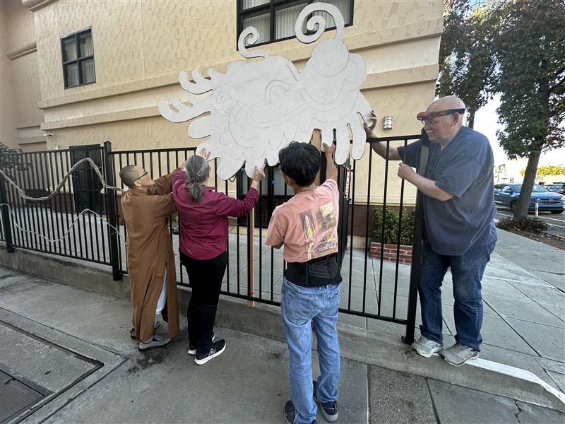 Lynette King, the designer of the outdoor Cloud and Water Dragon (second from the left), tests the capacity to support the dragon's head along with the volunteers. photo/Hsi Fang Temple