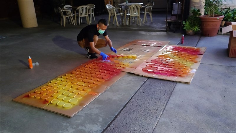 Volunteer spray-paints recycled plastic lids in bright red, orange, and gold, to be used as the “lucky scales” of the Cloud and Water Dragon. photo/Hsi Fang Temple