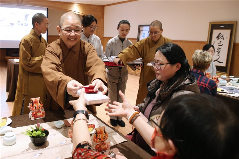 Abbess Venerable Chueh Fan presented the book written by the Most Venerable Hsin Bao, and auspicious golden coins for the Year of the Dragon as auspicious blessings for teachers. photo/Tracy Liu