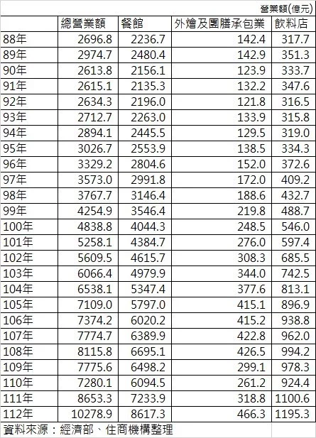 【本報台北訊】據經濟部最新資料,2023年餐飲業總營業額達到1.02兆元,是首次突破兆元大關,比2022年增加18.8%,其中餐館類首次突破8000億大關,飲料店連續第二年突破千億大關,外燴與團膳承包業亦穩定成長。