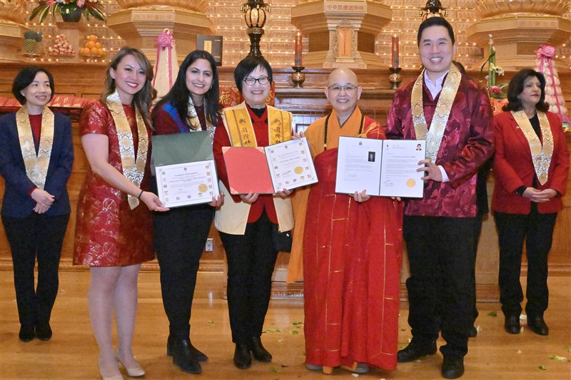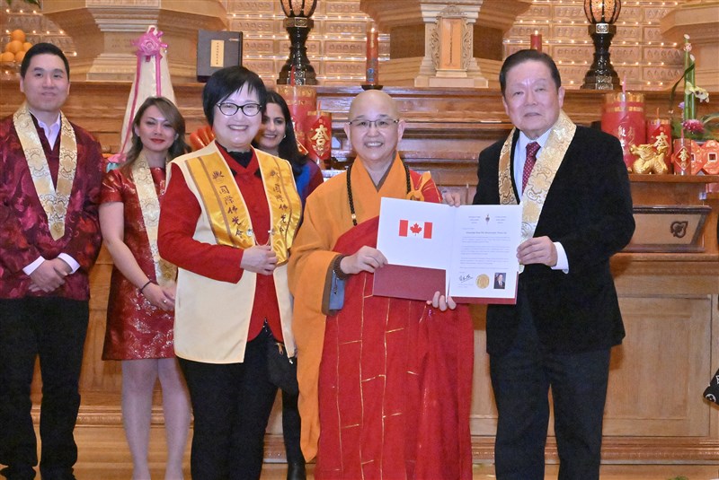 Canadian government representatives, including Ministers Rechie Valdez and Kamal Khera, and MP Shaun Chen, present a congratulatory letter from Prime Minister Trudeau to Fo Guang Shan Temple of Toronto. photo/The Life News Agency