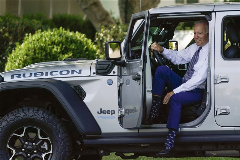 美國總統拜登從油電混合車Jeep Wrangler Rubicon 4xE下車,整體氛圍就像廣告照片。圖/美聯社