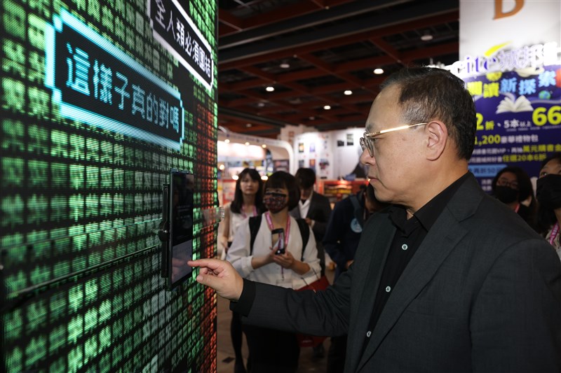 「數位主題館」的互動裝置將依參與民眾輸入的名字,解構成各種元素,打造專屬且富有想像力的電子書封面。文化部長史哲前往展位體驗,創造自己的電子書封。圖/文化部提供