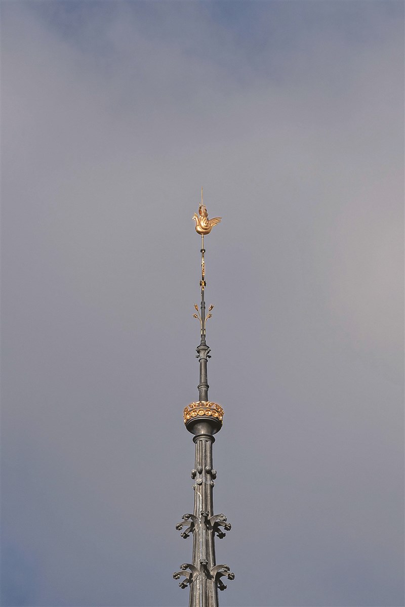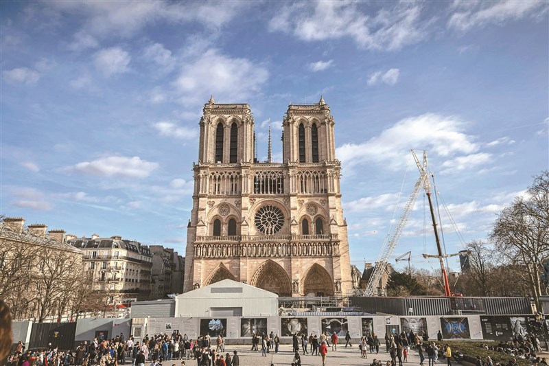 法國地標巴黎聖母院2019年4月遭大火毀損,經重建後預計今年12月重新開放。其中塔尖的公雞為其著名特色,遊客可清晰看見尖塔聳立,也顯示修復將進入最後階段。照片攝於17日。圖/美聯社