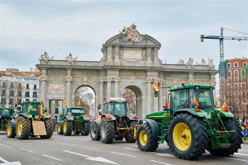 歐洲農民抗議浪潮蔓延到西班牙,根據西班牙廣播電視公司(RTVE)報導,全國各地農業組織在經過1個月動員抗議後,4000名身穿黃背心的農民昨天在工會聯盟(Unión de Unions)號召下,駕駛約500輛耕耘機兵分5路進入首都馬德里市中心,自阿爾卡拉門(Puerta de Alcalá)紀念碑集合,一路前進到農業部門口示威。