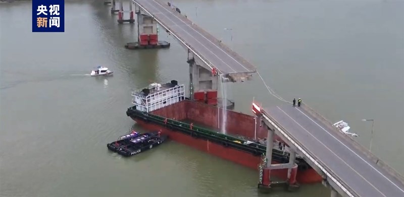 廣州南沙瀝心沙大橋22日清晨遭一艘貨櫃輪撞斷。圖/取自央視新聞