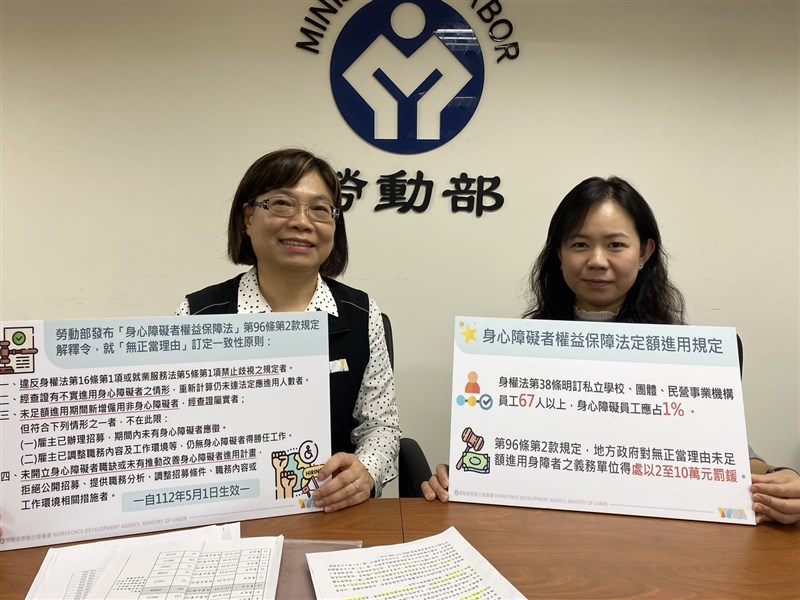 據身權法規定,私立學校、團體及民營事業機構員工總人數在67人以上者,應進用身心障礙者人數至少1人且不得低於員工總人數百分之一。無正當理由違反此規定者,由直轄市、縣市勞工主管機關處2萬元以上10萬元以下罰鍰。但受限無正當理由為不明確概念,勞動部勞動力發展署去年發布解釋。