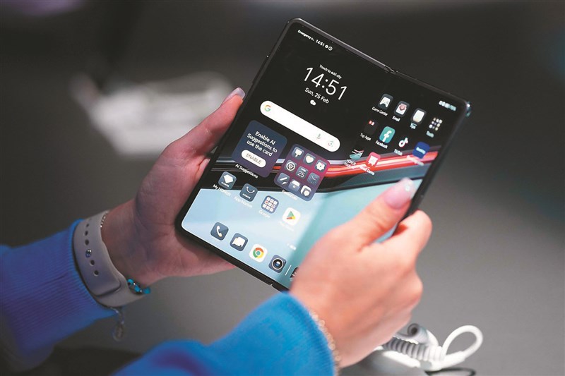 世界行動通訊大會(MWC)在西班牙巴塞隆納舉行。圖為1名女子手持中國大陸智慧型手機製造商榮耀,和德國汽車製造商保時捷合作開發的智慧型手機Magic V2 RSR。圖/法新社