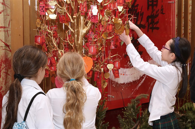 Students write down their New Year wishes on Bodhi leaf wish cards, carefully stamping on Three Acts of Goodness and Four Givings symbols, and hanging them onto the wishing tree. photo/The Life News Agency