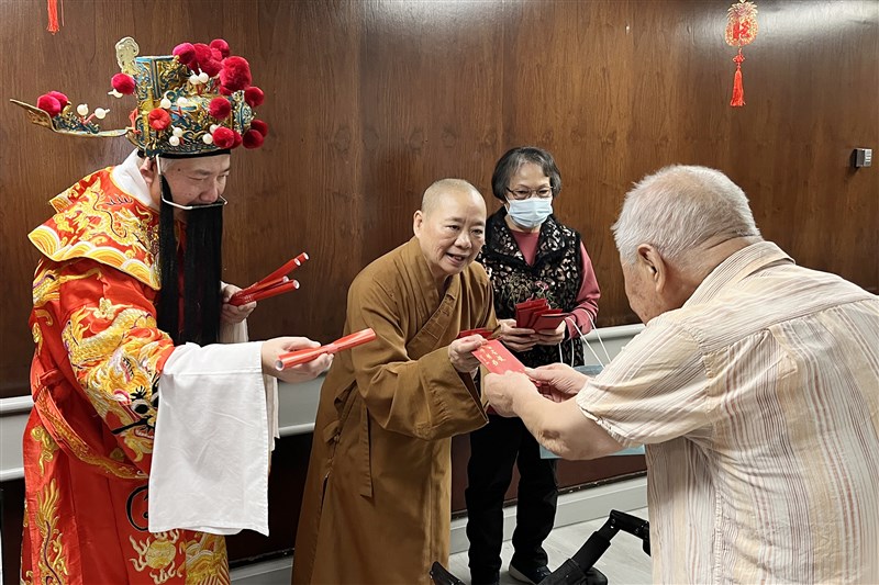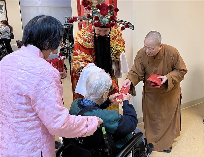 Venerable Miao Tsun distributing auspicious red envelopes and the Venerable Master’s New Year Greeting couplets, offering blessings to the seniors. (Photo by Dingzhen)