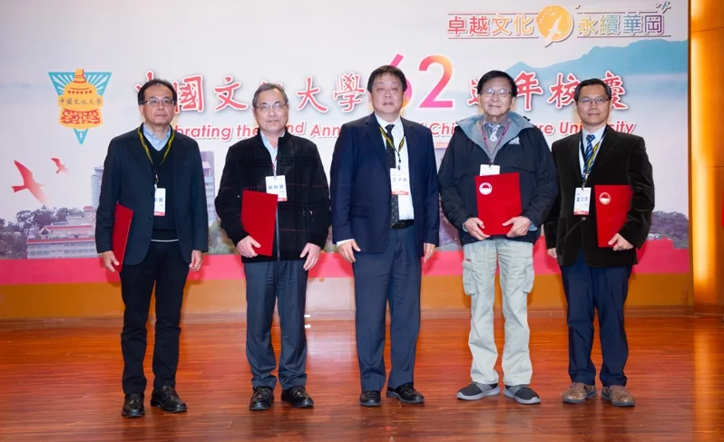 文化大學今天舉行校慶活動,會上校長王子奇(中)授予2020至2022年度連續三年榮登「全球前2%頂尖科學家榜單」理學院蘇平貴院長(左一)、電機系謝劍書教授(左二)、化材系施漢章教授(右二)、商學院盧文民院長(右一)獎項。圖/文大提供
