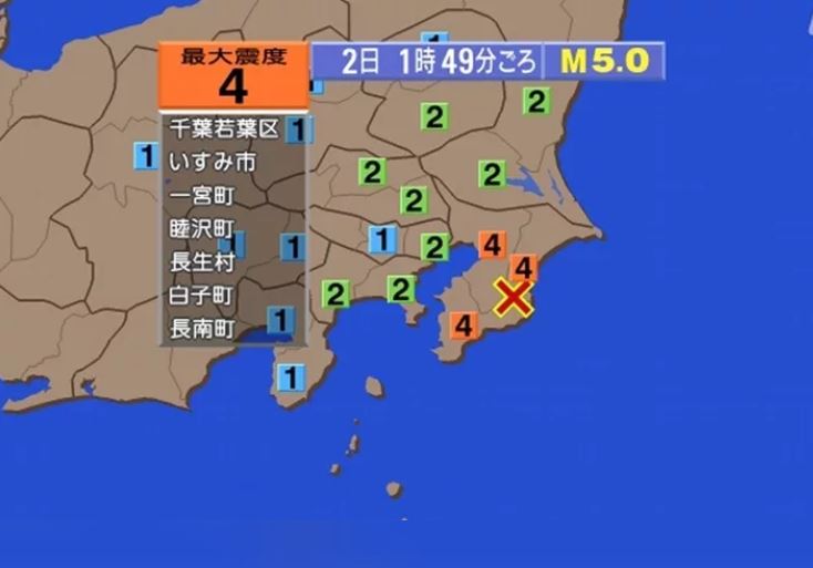 日本氣象廳表示,2日凌晨1時49分左右,發生震源位於千葉縣南部、深度約20公里的推估規模5.0有感地震。圖/取自日媒NHK