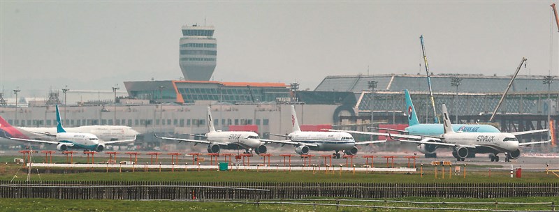 桃園機場南跑道年度歲修,單跑道運作造成許多航班延誤,但見滑行道上飛機排隊等待起飛。圖/葉信菉