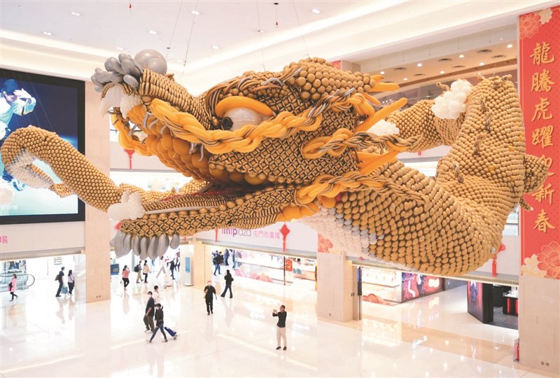 香港屯門市廣場中庭,展出41.77公尺長、由3.8萬個氣球手工製作而成的巨龍。圖/新華社