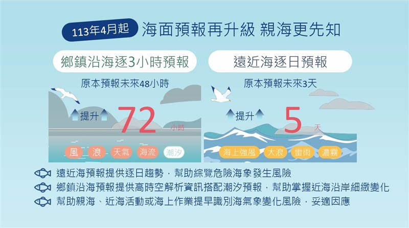 氣象署說明,為持續配合推動行政院「向海致敬」政策,已建置高速運算電腦,將自今年4月1日起延長海面海象及天氣預報時效,遠海及近海預報服務部分,時效將由原先的3日增長為5日,提供包含遠海15大分區及近海17分區之風、浪及天氣逐日資訊。
