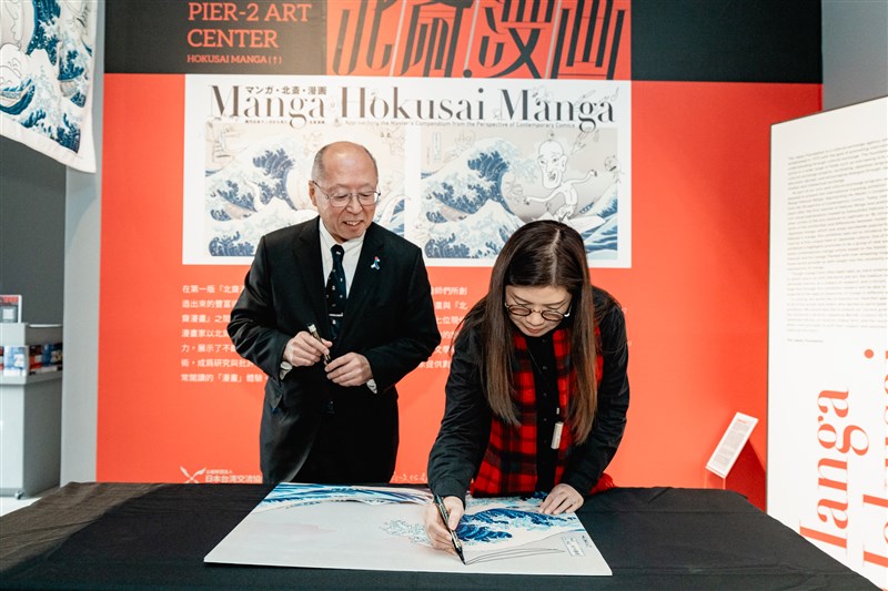 高雄文化局長王文翠與日本台灣交流協會高雄事務所所長奧正史,今(8日)共同為展覽揭開序幕,雙方在這次作為主視覺的「神奈川沖浪裏」畫作上簽名。