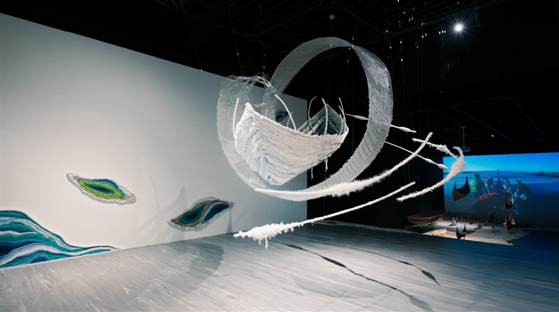 尤瑪‧達陸新作《河.流.海.揚》,島嶼的上方懸掛著被迴旋式海浪捲起的一條船,海浪中以傳統纏繞的方式意象式地呈現櫻花鉤吻鮭,隱喻著山居的泰雅族人不要忘了自己來自於海洋。圖/公視提供