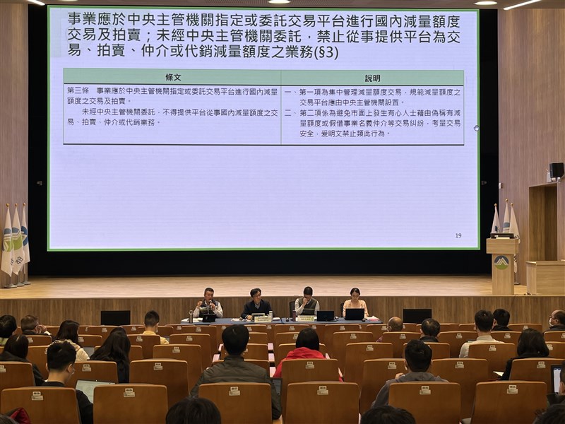 他並說,有關(草案第11條)中央主管機關於必要時,得就「交易及拍賣公開閱覽前」、「交易期間」及「賣方事業於交易平台交易期間申請變更」等情形指定減量額度的交易及拍賣價格的上下限,可避免落入炒作。也有與會者建議將「必要時」訂定參考指標,以利明確化。
