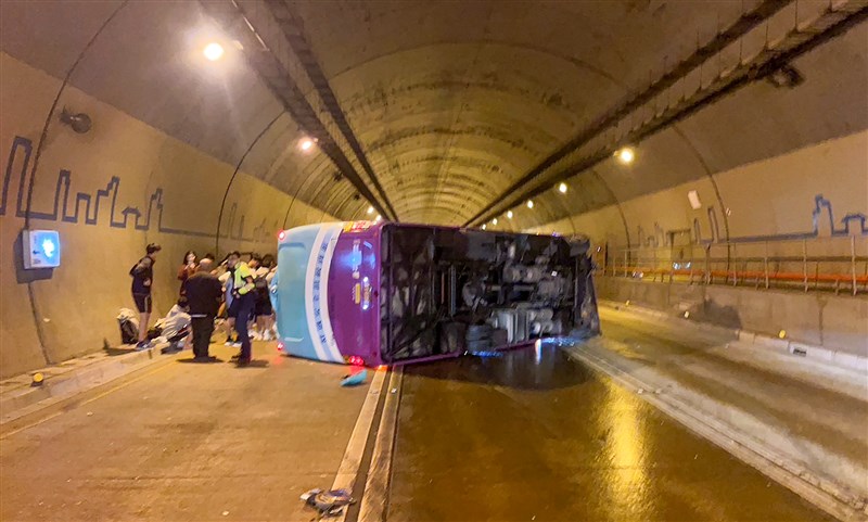 台北市文山區文山隧道內,康橋中學一輛校車沿信義快速道路往信義區行駛時,突然發生翻覆意外,事故原因有待釐清。圖/中通社