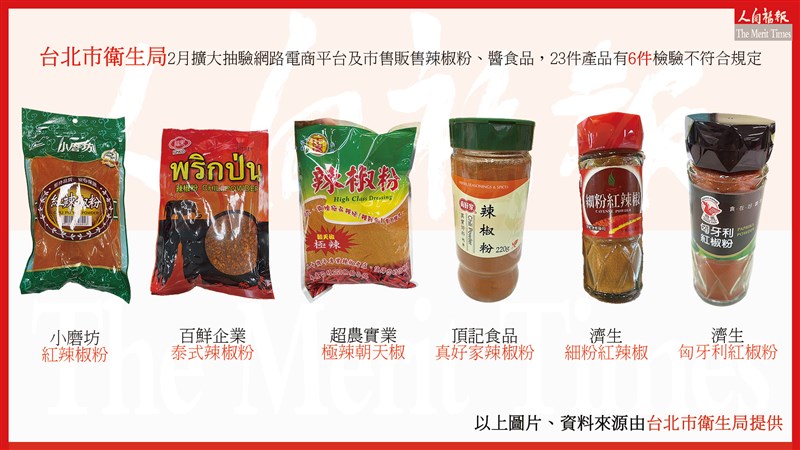 北市衛生局2月擴大抽驗網路電商平台及市售販售辣椒粉、醬食品,23件產品有6件檢驗不符合規定。圖/台北市衛生局提供