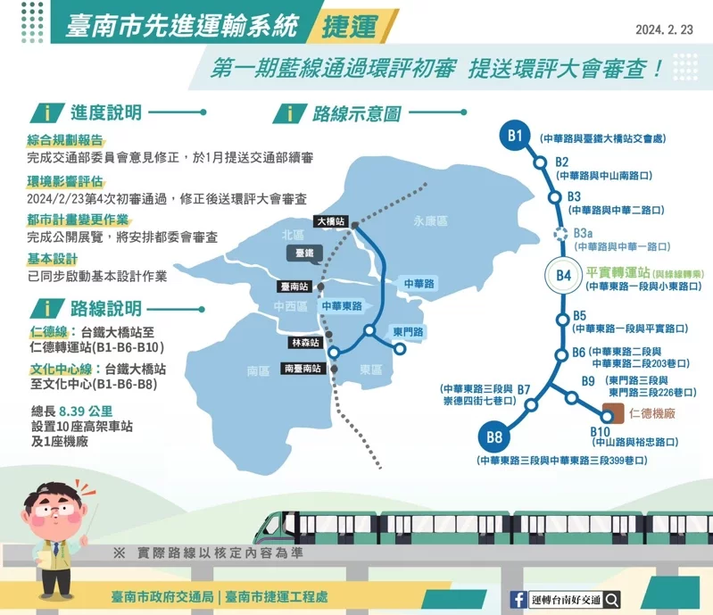 交通局指出,捷運藍線計畫範圍北起永康大橋站,南至東區文化中心站,東至仁德轉運站,串聯永康區、東區、仁德區生活廊帶,路線全長約8.39公里;設有10座車站及1座機廠;計畫總經費324.37億元(自償率25.30%),預計2026年動工,目標2031年完工。