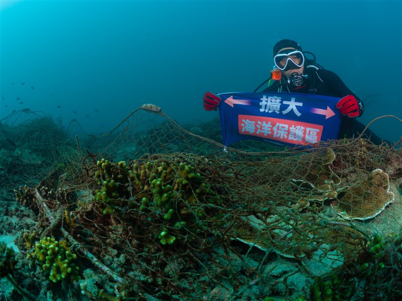 綠色和平指出,2022年於澎湖發起淨海行動在水下發現大批廢棄漁網覆蓋珊瑚,凸顯海洋保育法立法的急迫性。圖/綠色和平提供