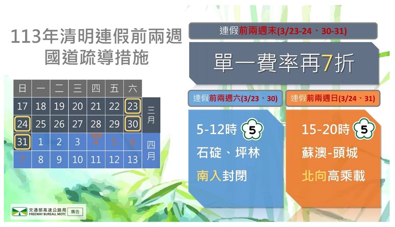 高公局表示,本次清明節連續假前2個周休除通行費率優惠措施外,另因國5交通需求將大幅增加並影響壅塞情形,於周六(3月23日及30日)上午5時至12時實施國5石碇、坪林交流道南向入口匝道封閉,並於周日(3月24日及31日)下午3時至晚間8時維持國5蘇澳、羅東、宜蘭及頭城交流道之北向高乘載管制。