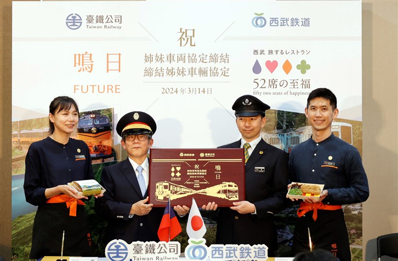 【記者吳亭頤綜合報導】台鐵公司與日本西武鐵道於104年3月14日簽訂姊妹鐵路協定,今年適逢締結滿九周年,今舉辦觀光列車「鳴日廚房」與「52席的至福」締結簽署典禮;台鐵表示,觀光列車首次跟國外締結協定,也是公司化後首次與國外的締結活動,未來搭乘兩列車的旅客均可獲得限量的紀念手冊及明信片。