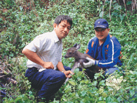 丹大工作站主任鍾國基(左)檢視受傷的小水鹿,護送到特生中心。圖/林務局提供