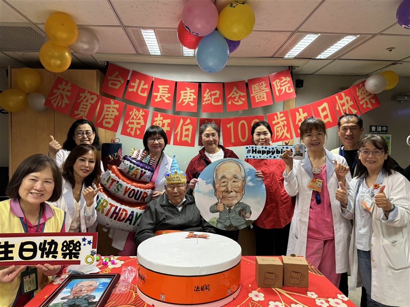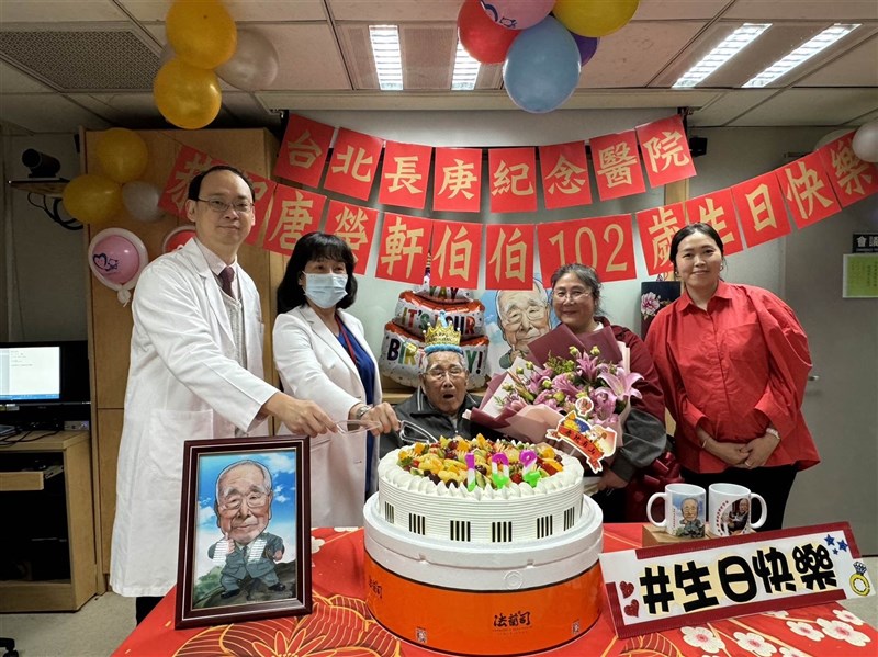 台北長庚醫院血液透析室同仁暨社工師、志工等一同協力布置,為102歲唐伯伯(中)道賀祝壽。圖/台北長庚醫院提供