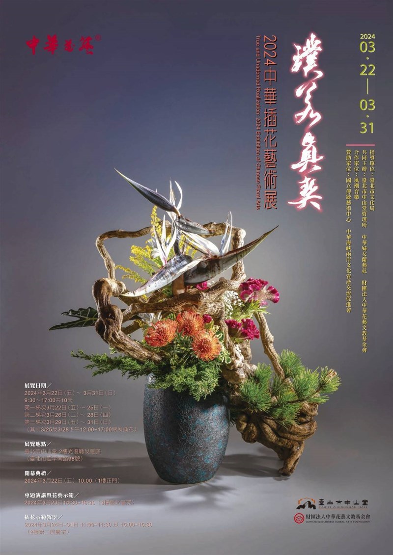 【本報台北訊】2024中華插花藝術展即將於台北市中山堂舉辦,本次以「璞若真契」為展出主題,展場以中華花藝的六大花器區分為:瓶花、盤花、缸花、碗花、筒花及籃花五個展區,展覽日期為3月22日到3月31日,分三梯次展出,除花展外,還有3月23日在台北書院舉辦專題演講和花藝示範表演,3月24日起每天上下午各有一場插花示範教學,中華花藝臉書粉絲團也會同步直播,提供更多民眾線上觀賞。