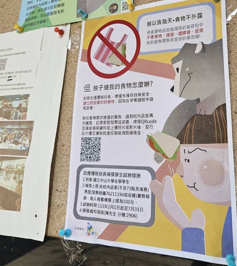 中山大學於公布欄公告「猴以食為天、食物不外露」,提醒同學如果遇到獼猴掠食,應優先確保自身安全,立即放棄物食,因為在雙方爭奪的過程中容易受傷。