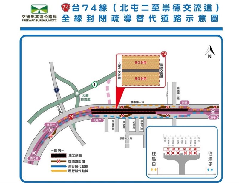第五警分局表示,因應台74線14K+500~17K+700(北屯二至崇德交流道)東西雙向全車道封閉,交通維持管制期間請用路人體諒配合行經此路段小心慢行,施工封閉期間原行駛於台74線主線的車輛改道路線: