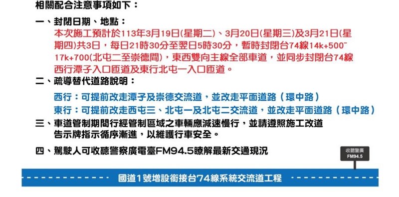 【本報台中訊】高速公路局辦理台74線快速道路銜接國道一號大雅交流道工程,今晚起連續3天封台74線14k+500~17k+700(北屯二至崇德間)東西雙向主線全部車道,同步封閉台74線西行向潭子入口匝道、東行向北屯一入口匝道,封閉時間是每晚9時30分至隔天清晨5時30分,警方提醒用路人提早改道。