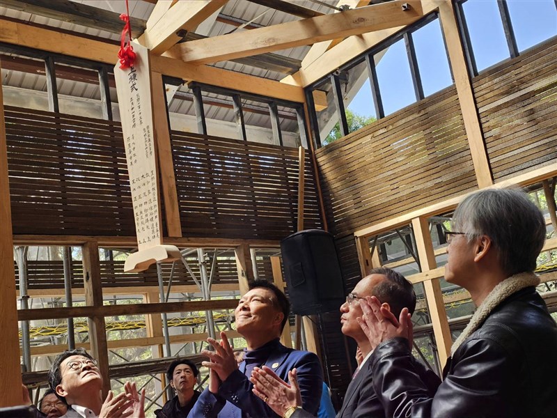 台北市市定古蹟「草山御賓館」預計民國115年修復完成,文化局長蔡詩萍(中)與文史學者等21日出席修復工程棟札儀式。圖/中央社